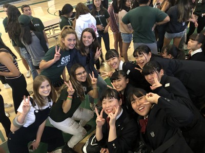 本日、6班では現地のSouth HSと交流しました。はじめは緊張した面持ちでしたが、徐々に打ち解けてコミュニケーションを取れるようになりました。本校は日本文化の紹介として「折り紙」と「書道」を披露しました。折り紙は、代表の生徒が前に出てデモンストレーションをしながら、全員で鶴を折りました。英語で説明しにくいところは各自が工夫しながら楽しく折ることができました。書道は書道部の齋藤成紀君が、現地の生徒と合わせて200人近くいる人の前で堂々と作品を完成させました。最後は齋藤君の作品をプレゼントしましたが、あまりの人気にじゃんけん大会を開催するほどでした。