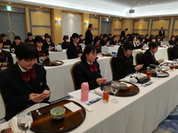 食育実践科 第1学年 オリエンテーション合宿3日目 平成31年4月15日(月) 食育実践科1年生オリエンテーション合宿3日目は、東京都の目黒雅叙園にて、和食テーブルマナーを実施しました。講師の先生に箸やお椀の持ち方、お椀と箸を同時に持つときの作法、そして和食の歴史など多くのことを学びました。生徒は将来会食の席についたときのことを想像しながら実践できました。また、目黒雅叙園にある豪華な和室宴会場を見学し、生徒は壁画などに興味津々でした。この3日間を経て、生徒は多くのことを学び、お互いをよく知り、今後の学校生活をより良く送れるようにする合宿となりました。
