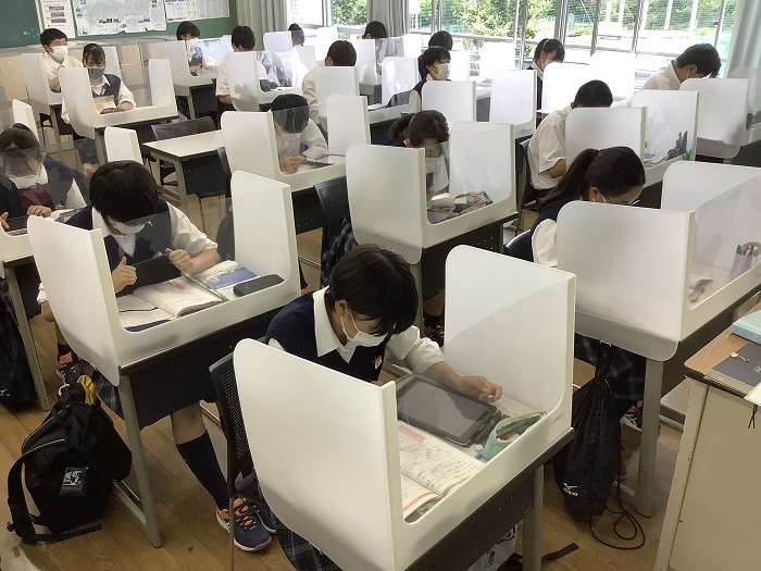 本校では、アクティブラーニング形式の授業を積極的に取り入れ、「主体的・対話的で深い学び」の実践に取り組んでいます。合わせて、ICT教育を推進し、1年生全員にタブレットを活用させた授業を実施しています。本日第6時限普通科1年7組(アドバンスコース・選抜進学クラス・コミュニケーション英語Ⅰ)の授業では「MetaMoJi ClassRoom」というアプリを利用して協働学習を行いました。「MetaMoJi ClassRoom」は、先生が生徒の学習状況をリアルタイムに把握できる授業支援アプリです。本時は生徒たちが解答した長文読解の設問に教師側がリアルタイムで添削・助言を行い、効果的な学習を進めていました。