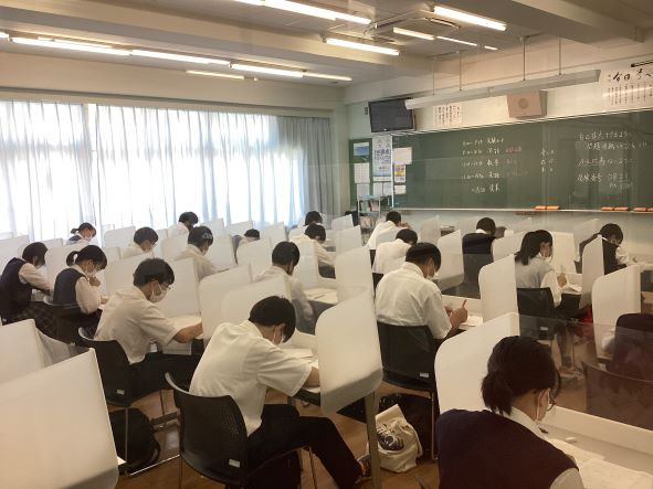 第2学年 ベネッセ総合学力テスト・7月の実施 6月27日(月)に第2学年の進学補習受講生徒を対象とした、「ベネッセ総合学力テスト」を実施しました。進級してから初めての模試受験で、事前に目標得点や志望校の入力を行い、準備をして臨むことができました。実際の入試を見据え、時間配分を考えながら、生徒は一生懸命問題に取り組みました。受験後は「マナビジョン」を用いて振り返りや弱点克服に努め、この結果を踏まえて担任・教科担当と連携して学力向上を図ります。