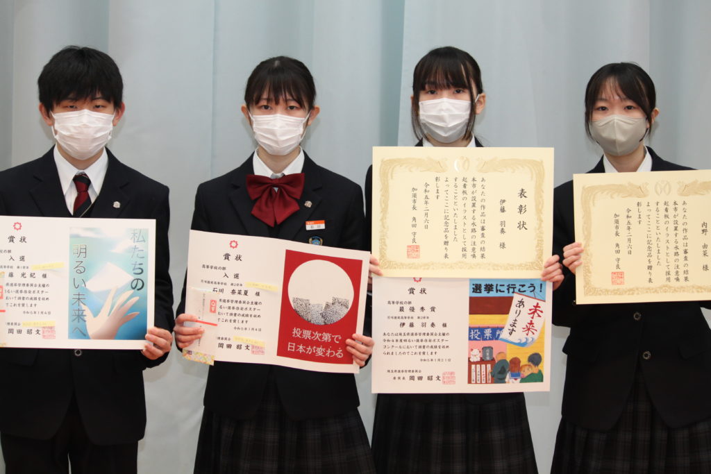修了式後には表彰伝達が行われました。「埼玉県 明るい選挙啓発ポスターコンクール」と、「加須市 水路注意喚起看板イラストコンクール」の受賞者が、それぞれ表彰されました。
