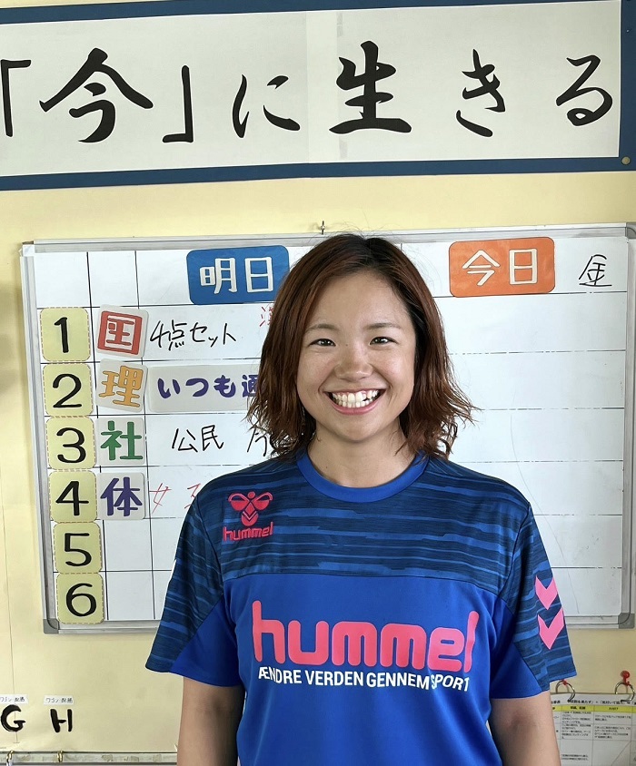 教員採用試験では、 臨時採用教員の仕事の合間を縫って一生懸命勉強し、 合格することができ、現在は教員5年目になります。日々充実した教員生活を送ることができ、 生徒たちとの交流や教育活動に取り組むことで、 やりがいや喜びを感じています。 バレーボール部時代に掲げていた『今に生きる』という言葉には、 「後先のことを考えて不安になるのではなく、今を大事にしよう。 」という意味があり、何度も背中を押されてきました。 クラスを持つようになってからは毎回教室に掲示しています。私の経験や情熱を通じて、生徒たちが夢や目標を持ち、 自己成長を果たすことをサポートしていきたいと考えています。 毎日笑顔で過ごせていることに感謝し、 彼らと過ごす一瞬を大切にしていきたいです。