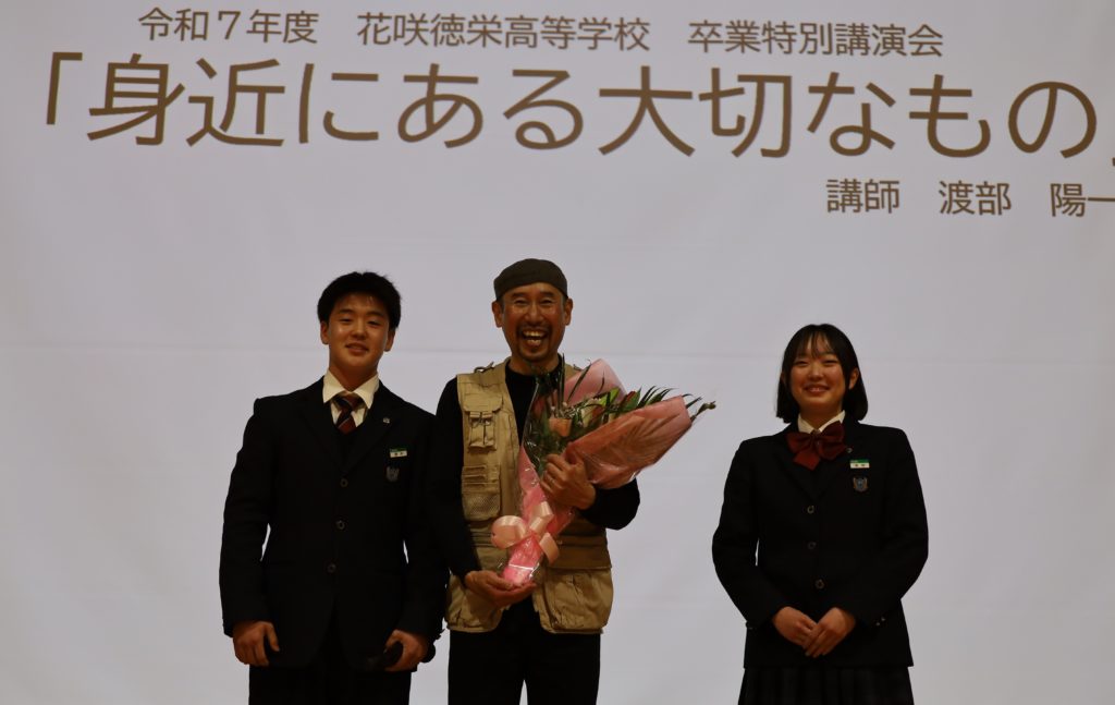 令和8年2月27日(金) 本校体育館にて、同窓会主催の卒業記念講演会が開催された。講師にはメディア等でも活躍されている戦場カメラマンの渡部陽一さんをお招きした。講演のテーマ「身近にある大切なもの」の中で、渡部さんがカメラマンを目指すきっかけや、戦地での経験などを実際の写真とともに紹介していただいた。渡部さんからの卒業を控える3年生たちへのメッセージとして、忙しい日々の中でも、自分の大好きなことを続けることの重要性についてお話がありました。また、質疑応答にも丁寧にご対応いただきました。渡部さん、ありがとうございました。