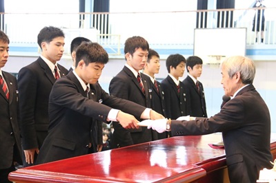 平成30年度 第1学期始業式 4月7日(土)、第一体育館にて1年生を含めた1883名が一堂に会し、始業式が行われました。校長先生からは、「建学の精神『人間是宝』-人は宝になれる-を体現するために、『今日学べ』の教えを実践し、豊かな未来を構築しよう。多くの人々に支えられていることを忘れず、人の心の痛みが分かる豊かな生徒になってほしい。2・3年生は折に触れて新入生を支え導いてあげてほしい。お互いの良さを讃え合えるような学期にしよう」との言葉がありました。 続いて、全国大会に出場したレスリング部、ボクシング部、吹奏楽部の表彰伝達が行われました。