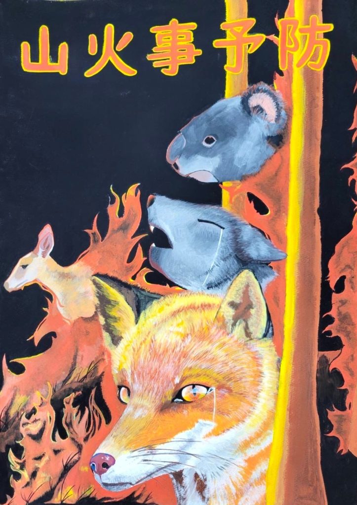 全国 令和7年度山火事予防ポスター用原画コンクールが総務省消防庁、文部科学省、林野庁、全国森林組合連合会、森林火災対策協会の後援で実施された。全国から4200点のポスター及び標語の応募があり、本校芸術類型美術専攻の2年 荒木さん(写真 上)が 第7席 日本森林林業振興会会長賞 を受賞、更に3年 小林さん(写真 下)が入選(全国で40点)を果たした。