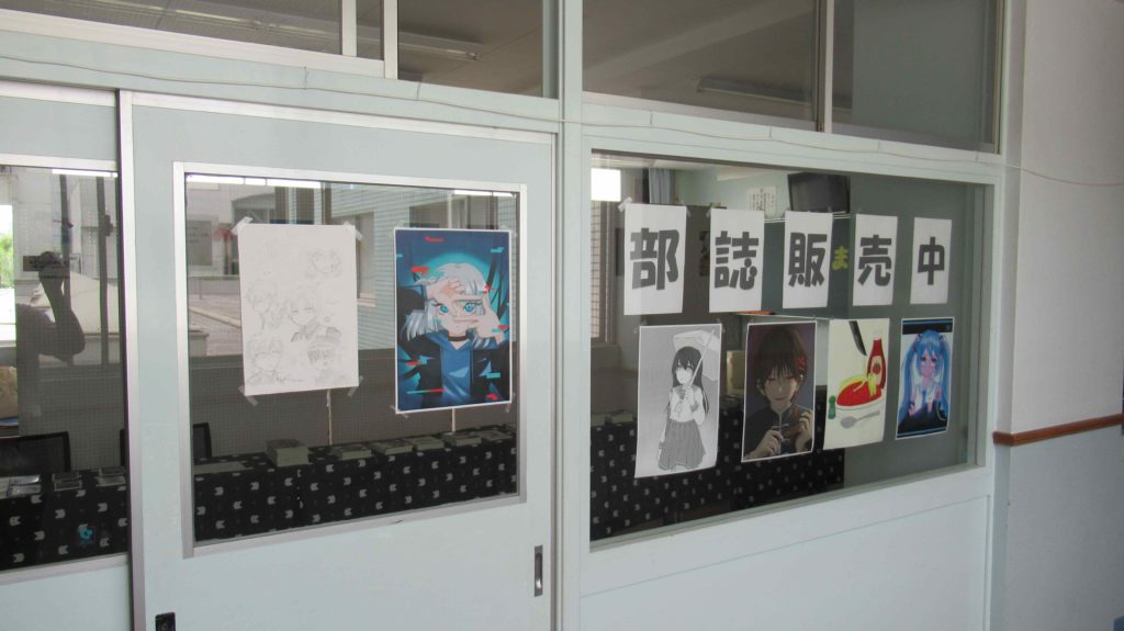 漫画研究部では、教室を1つお借りしてイラストの展示と部誌・ポストカードの販売を行いました。昨年度の卒業生が制作した記念誌(新刊)と歴代の部誌が並んだ光景は、圧巻でした。