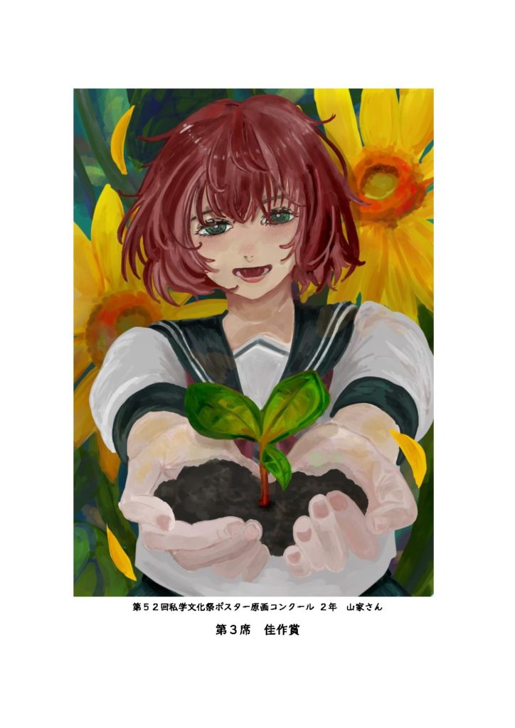 第52回埼玉県私学文化祭にて埼玉県教育委員会会長賞 他多数受賞 第52回埼玉県私学文化祭がさいたま市浦和区の埼玉会館にて11月2日、3日の2日間、開催され、美術部1年生から3年生まで20名が油絵や水彩、ポスター原画コンクールなど多彩な作品を出品した。 受賞は次の通り。 □作品展 絵画部門 受賞結果 第2席 埼玉県教育委員会会長賞 3年 石橋 さん 第5席 埼玉県私立中学高等学校協会会長賞 2年 新井さん 第8席 優秀賞 3年 飯塚さん 2年 伊藤君 第9席 佳作賞 2年 高橋さん □私学文化祭 ポスター原画コンクール 受賞結果 第2席 優秀賞 2年 新井さん 第3席 佳作賞 3年 大川さん 2年山家さん