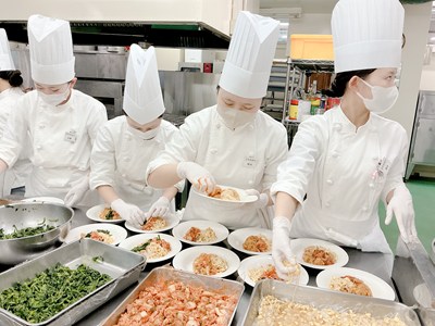 今回の企画は、ニッポンハムグループ各社から、食材の提供(8品目)を受け、それをもとに食育実践科の2年生有志4名がメニューの考案をしました。