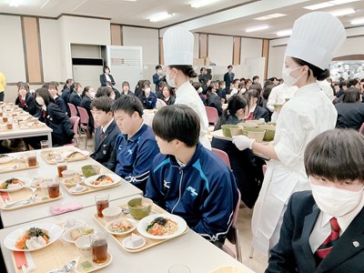 当日は、食育実践科2年生22名が調理・配膳を行い、本校食育実践科の「アスメシ(アスリートメシ)」として提供しました。
