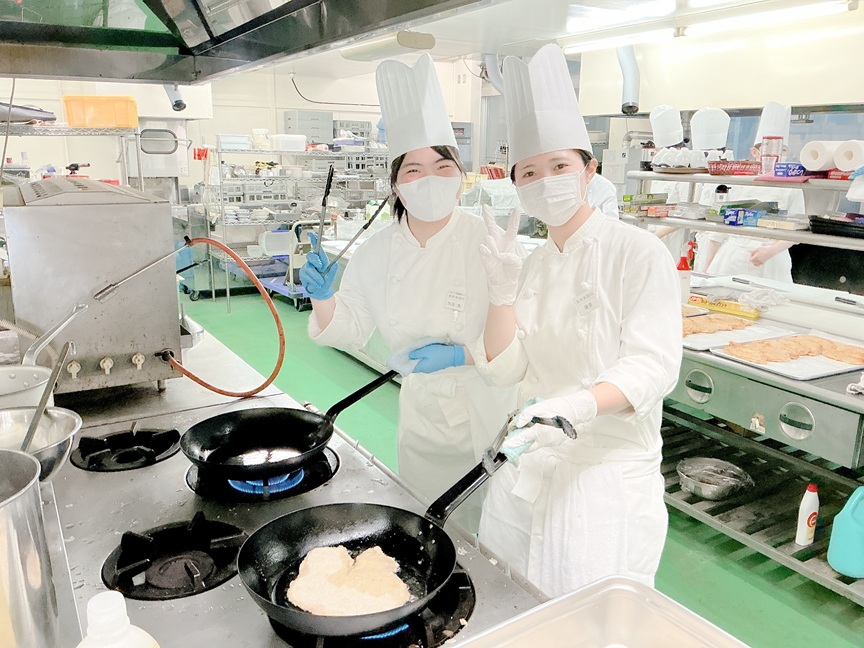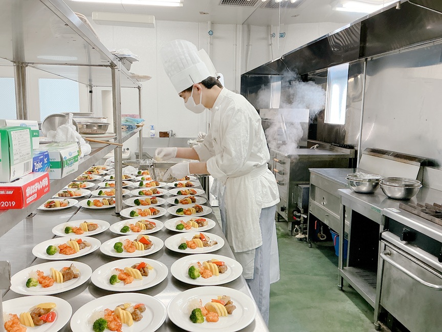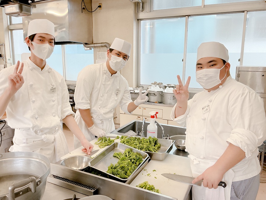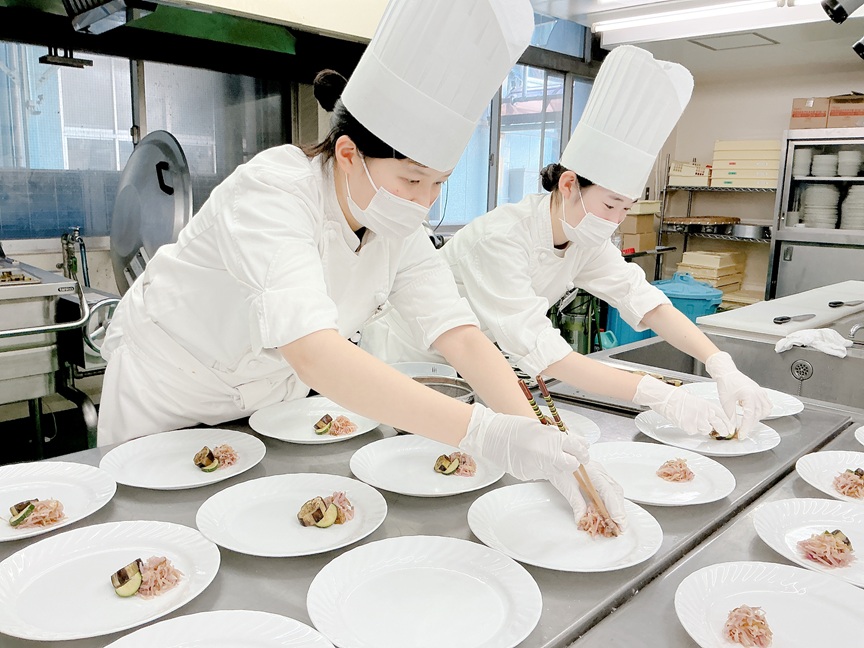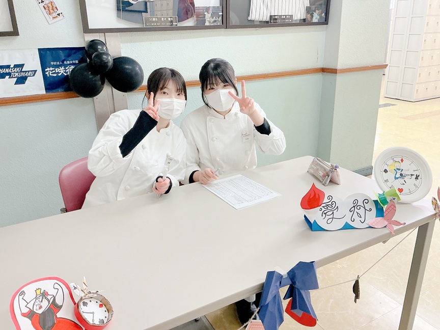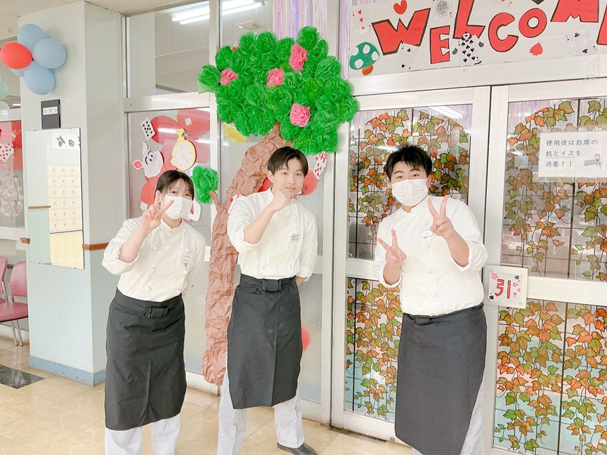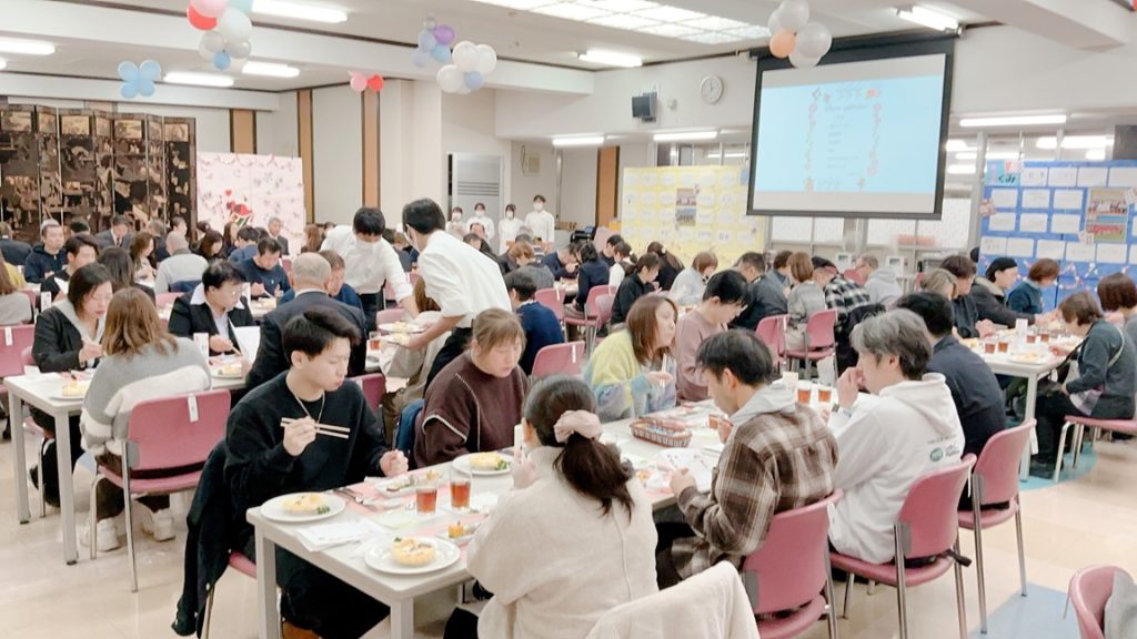 会場の試食室は手作りの装飾を施し、料理は調理担当者が各セクションに分かれて仕込みから盛り付けを行い、お客様へ提供しました。終盤には生徒が作成した卒業に向けて伝えたいメッセージの動画を放映、そして代表生徒による感謝の言葉で締めくくると、感極まる保護者も見受けられました。お土産には生徒から保護者への手紙を用意し、精一杯の感謝の気持ちと成長した姿を伝えることができました。生徒自身がどのように感謝の気持ちを表現するか考え、試行錯誤を繰り返しての開催となりました。